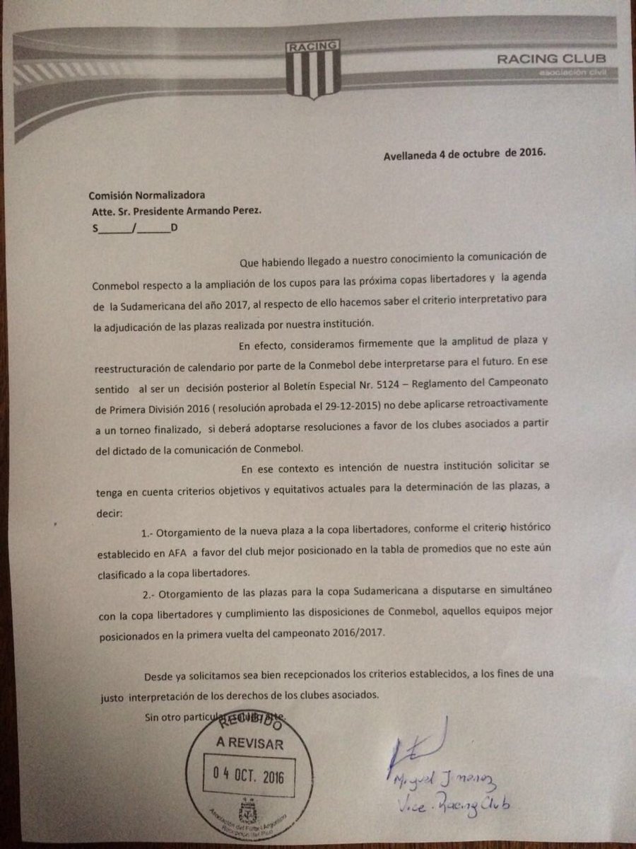 Los dirigentes del club de Avellaneda enviaron una carta a la Asociación del Fútbol Argentino solicitando que consideren la tabla de los promedios para determinar al último clasificado a la Copa Libertadores del próximo año. Claro está que Racing está primero en dicha tabla, un punto arriba del Ciclón que marcha segundo y a seis de Estudiantes, que marcha tercero.