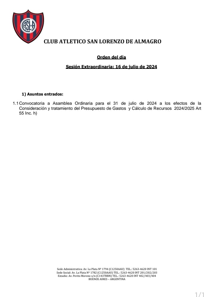En las últimas horas, la secretaría de San Lorenzo convocó a una reunión de comisión directiva, que se llevó hoy, con la finalidad de analizar sobre una sola temática: el pase a la Asamblea de socios del 31 de julio sobre el tratamiento del Presupuesto de cálculo y recursos de 2024/24, información que emitida a los asambleístas, que fue aprobada por unanimidad.