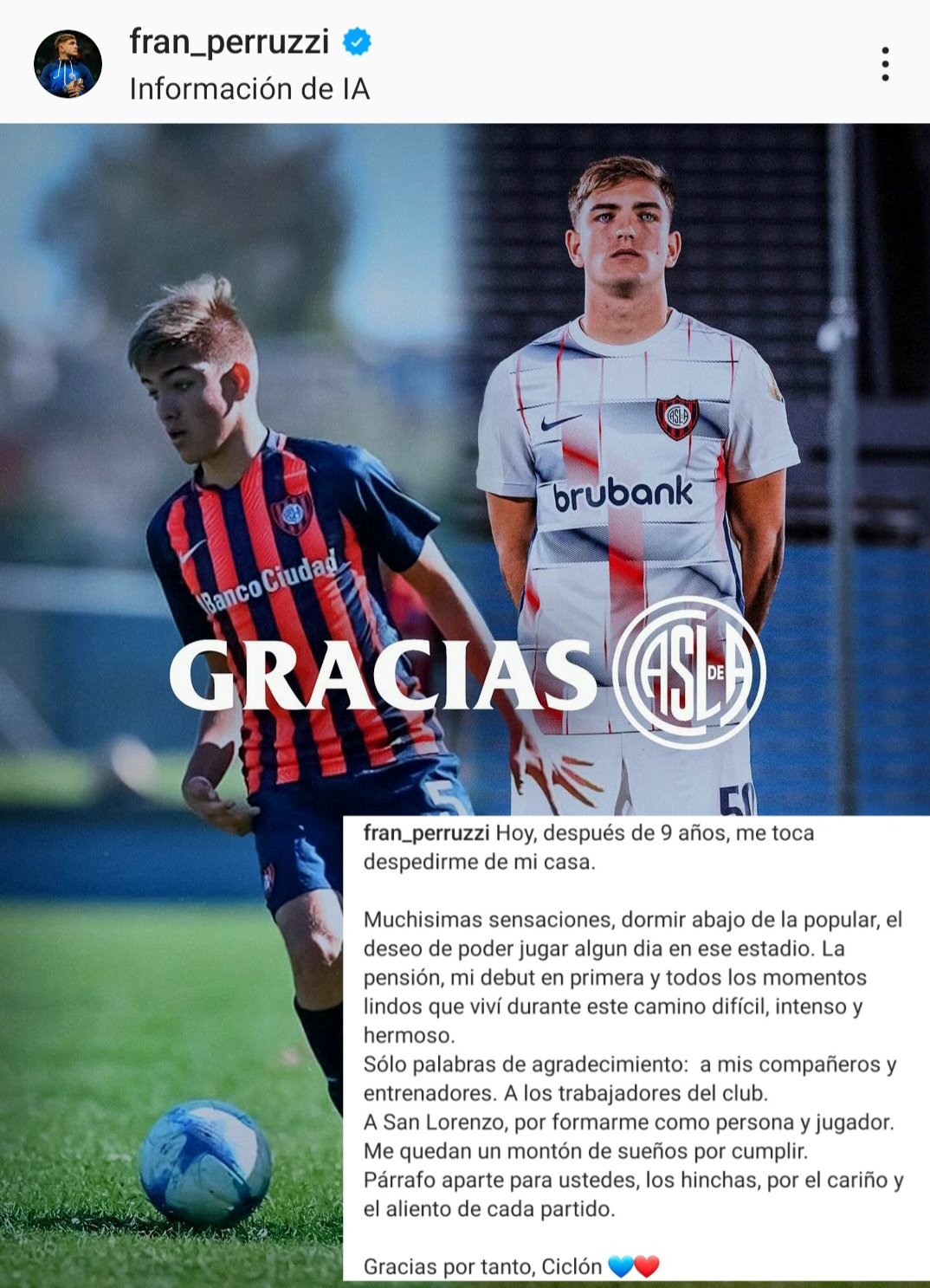 Su despedida siguió con palabras de agradecimiento: “A mis compañeros y entrenadores. A los trabajadores del club.A San Lorenzo, por formarme como persona y jugador. Me quedan un montón de sueños por cumplir. Párrafo aparte para ustedes, los hinchas, por el cariño y el aliento de cada partido”