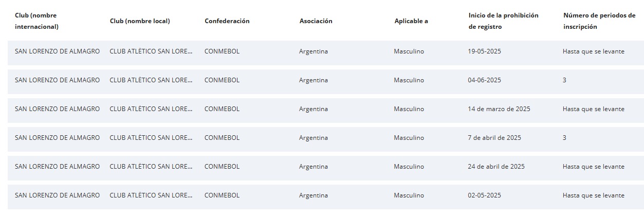 EL ESTADO DE LAS INHIBICIONES DE SAN LORENZO POR LA FIFA
