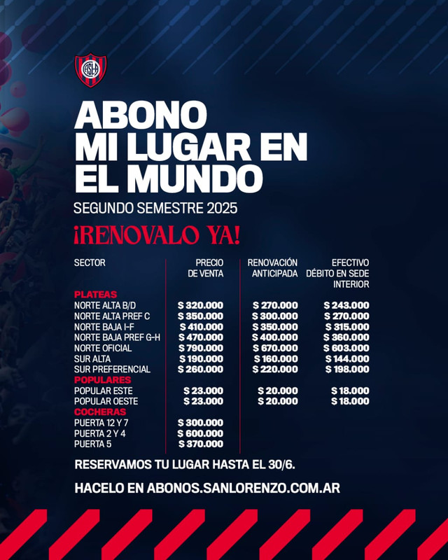 San Lorenzo abrió la renovación de abonos para el segundo semestre de 2025 bajo el lema “Mi lugar en el mundo”. Los precios ya están publicados y habrá beneficios para quienes paguen con anticipación o realicen el trámite en la sede del club.