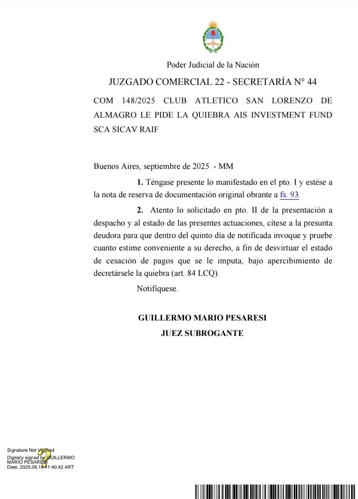 La crisis institucional y económica de San Lorenzo sumó en las últimas horas un capítulo alarmante. El Juzgado Comercial N° 22, Secretaría N° 44, dio curso al pedido de quiebra presentado por AIS Investment Fund, contra el Club Atlético San Lorenzo de Almagro.