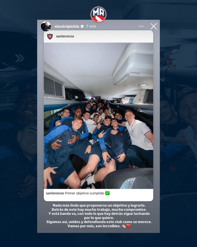 Finalmente, Nicolás Tripichio compartió un mensaje más extenso: “Nada más lindo que proponerse un objetivo y lograrlo. Detrás de esto hay mucho trabajo y compromiso. Y esta banda va, con todo lo que hay detrás, sigue luchando por lo que quiere. Sigamos así, unidos y defendiendo este club como se merece. Vamos por más, son increíbles”.
