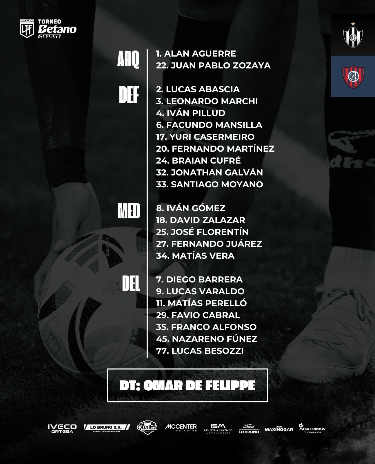 Posible once titular: Alan Aguerre; Santiago Moyano, Lucas Abascia, Jonathan Galván, Brian Cufré; Matías Perelló, Iván Gómez, José Florentin, Matías Vera; Leonardo Heredia y Gastón Verón o Lucas Varaldo.