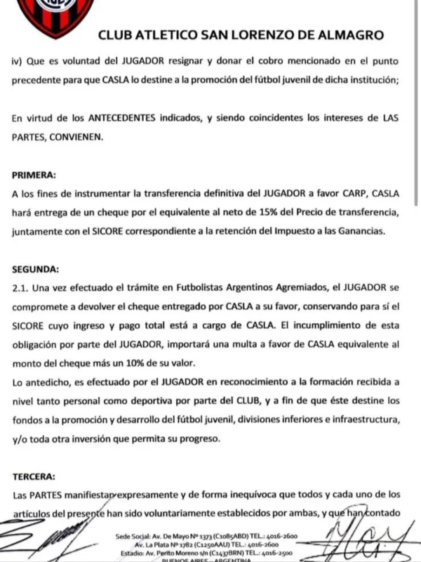 El Yacaré pasó al Millonario en febrero de 2022 por una cifra cercana a los 2.500.000 dólares. Tras una temporada en Núñez, decidió iniciar acciones legales contra la institución azulgrana exigiendo aquel 15% que había acordado dejarle al club. “CASLA hará entrega de un cheque por el equivalente al neto del 15% del Precio de transferencia”, indica el acuerdo firmado por ambas partes. Luego agrega: “El jugador se compromete a devolver el cheque entregado por CASLA a su favor”.