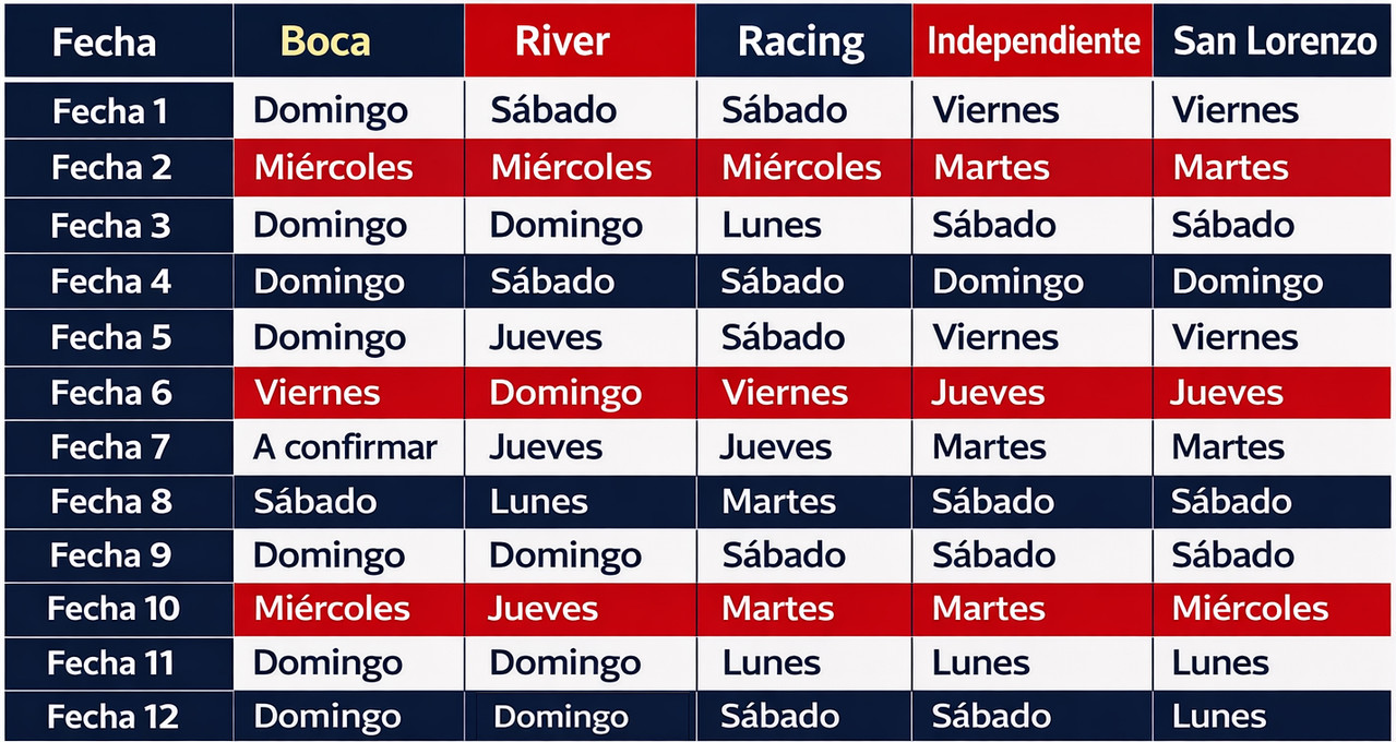 El Ciclón tiene solo cuatro partido entre sábado y domingo, mientras que Independiente y Racing tienen cinco, River siete y Boca ocho -resta confirmar el día y horaria de la fecha 7-.
